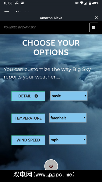 打开Alexa应用并查找 Big Sky-帐户设置卡。点击关联帐户,然后输入您的完整地址。在此之下,您可以选择一些选项,例如详细程度和温度/风速单位。滚动到页面底部,然后点击提交以完成此操作。