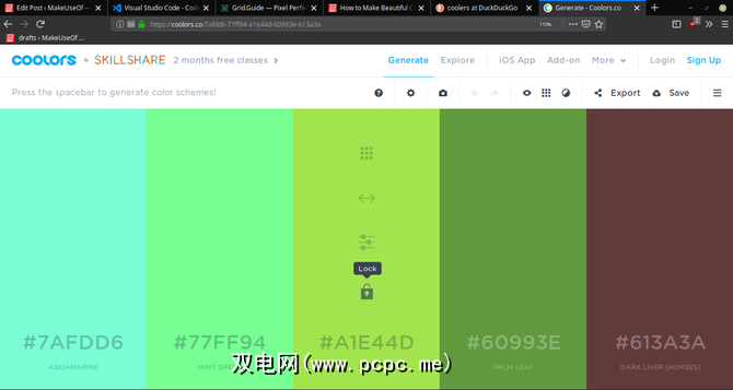 空格键会生成一个新的调色板作为起点。每种颜色都带有替代品和调整工具,以使其恰到好处。对颜色满意时,可以锁定它并基于该颜色生成新的颜色。在所有浏览器中都是免费的(并且是iOS应用程序),它是所有前端设计人员的绝佳工具。