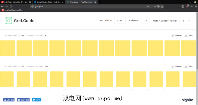 它返回示例,说明不同大小的网格设置的外观以及在视觉设计中复制它所需的像素值。网格是可共享的,可以作为PNG文件使用,以供以后参考。