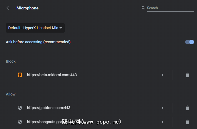 网站可能会使用麦克风进行通信或出于某些目的录制音频。像上面一样,您可以在任何地方屏蔽它,也可以使网站每次都问。此页面还允许您将哪个麦克风设置为默认麦克风。