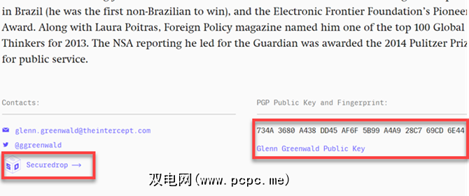 Glenn为潜在的举报人提供了两种安全的方法来与他进行通讯。第一个是Securedrop链接,该链接允许某人将敏感文件或消息放置到只能由设置了该消息的新闻机构访问的存储库中。