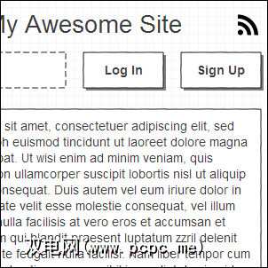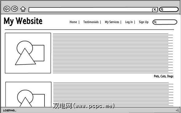 网站线框只是您希望网站外观的草图。它不应该很漂亮,甚至您都不需要软件来创建它。您可以只抓一张纸,甚至一张餐巾纸,然后逐个元素开始在您的网站中进行屏蔽。 “ 标题在这里……然后我们有一个导航菜单……哦,在这里我可以放一个搜索框。"简而言之,将您网站的一部分放在一起,直到最终结果看起来像这样:
