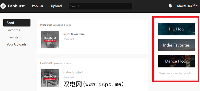 除了邀请工具之外,网站上的流派分为三个主要部分: 嘻哈,独立和舞蹈。它们都可以通过屏幕右侧的菜单进行访问。点击一个,您将获得一个永无休止的播放列表,其中包含您所选择类型的网站上最受欢迎的曲目。如果要查看更细粒度的数据,可以单击“查看更多趋势播放列表"。