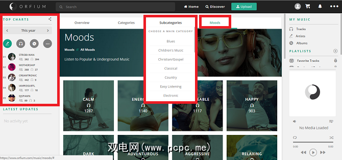 从音乐发现的角度来看,该网站的主屏幕提供了指向热门排行榜的链接(按日,周和月),但是当您单击时,事情开始变得非常有趣。页面顶部的“发现"标签。您会在平台上找到几种类型的最受欢迎曲目,并且可以使用 Sub-Categories (子类别)和 Moods 菜单进一步深入研究。