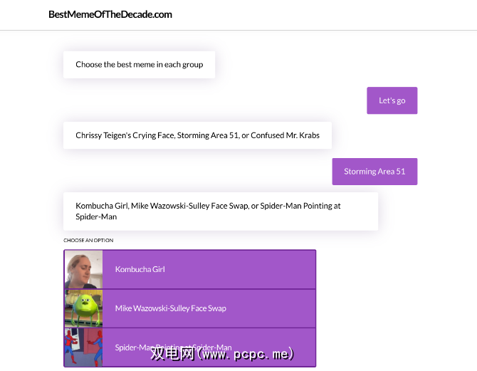 投票就像是Messenger机器人的测验。它为您显示了组中模因的三个选项,而没有告诉您类别是什么。选择您喜欢的并继续前进。这是一个相当长的测验,所以请确保您有一些空闲时间。当您达到25%,50%和75%时,测验问题会更新,因此您不会怀疑要花多长时间。