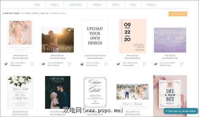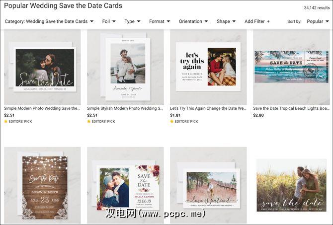 您可以浏览“保存日期"照片卡和明信片,或缩小范围。选项。从箔,类型,格式,方向,形状或大小等方面进行选择。一旦看到结果,就可以按受欢迎程度或价格进行排序。