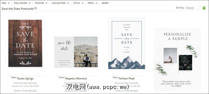 在“保存日期"中您会找到精美的卡片,明信片和磁铁部分。您可能已经猜到了,可以使用过滤器来缩小选择范围。选择样式,颜色和照片数量。然后,选择是否只希望将那些设计用作磁铁,箔纸或凸版印刷。