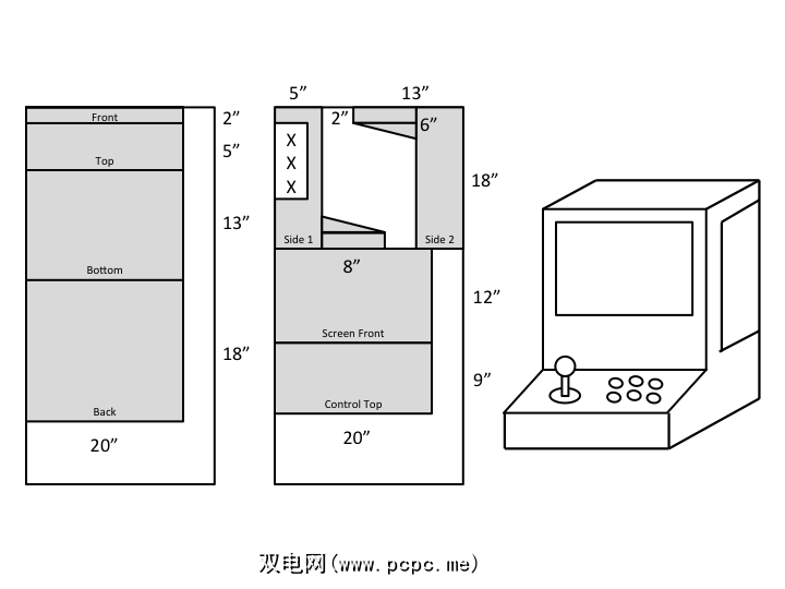 您可以使用这些计划,也可以创建自己的计划,但是此外壳具有出色的人体工程学原理,并且空间足够轻松滑动屏幕 进进出出。您可能需要调整整体尺寸以适合要使用的屏幕。我将控制台外壳的所有零件都安装在两个2英寸x4英寸,¼英寸厚的MDF板上,还需要一点备用。 1/4英寸MDF非常适合此应用,因为它既厚又结实,足以在游戏过程中支撑您的手,但又轻又能携带。计划完成后,我测量了切口并将其绘制到MDF上。