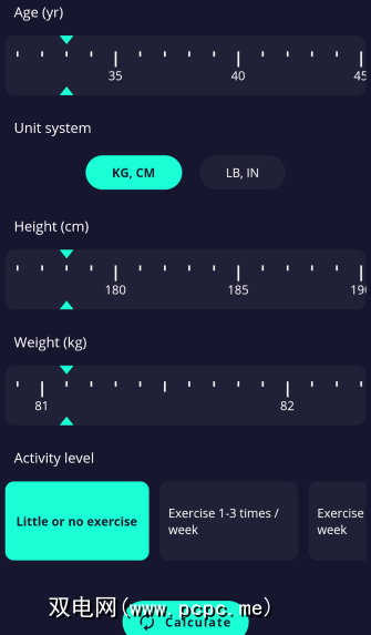 在第一个屏幕中,选择您的年龄,身高,体重和运动水平。基于此,Adlee将根据体重不足(蓝色),健康体重(绿色),超重(黄色)和肥胖(红色)的等级来计算您当前的BMI。您还将获得一个卡路里消耗量,该卡路里量表明您应该吃多少东西来维持,增加或减轻体重,这表明您有多少要减肥。