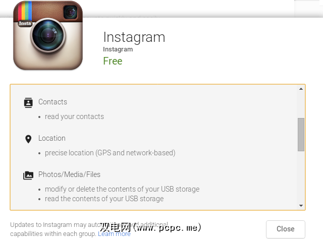 这种方法的问题并不仅限于此。几年前,每个权限被单独列出。如果选择,应用会自动更新-除非添加了新权限。发生这种情况时,您必须在更新新权限之前明确单击“接受",以便应用相同的“接受或保留它"规则,并且可能会通过添加新权限破坏应用程序。