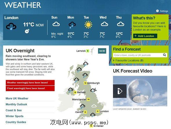 The主页提供与天气有关的新闻报道,以及有关极端情况的视频和观察长期趋势的观点。单击天气会显示当前状况,并突出显示严重的天气警告和警报。还有未来几天和几周的天气预报,以及一张迷人的Weather In Motion地图,其中显示了天气状况的变化。