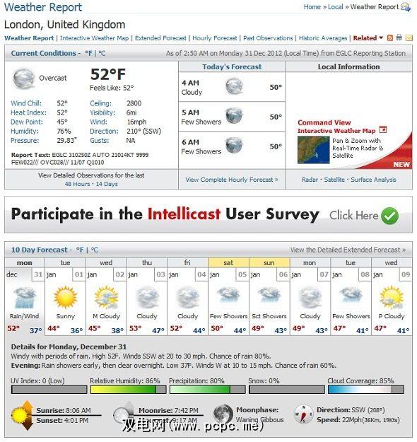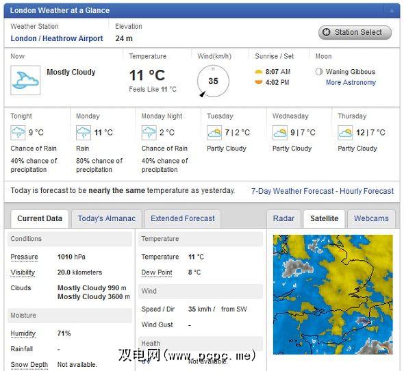 天气地下是另一个旨在提供更多信息的网站,任何电视天气预报员都可以传授给观众。巧妙的网站设计意味着最相关且易于阅读的数据位于页面顶部,更详细,令人讨厌的数据隐藏在页面的下方,只有那些想要查看的人才能找到它。