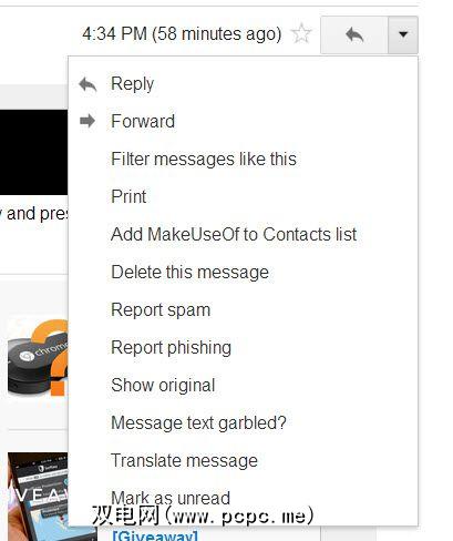 一旦您在Gmail中打开了电子邮件,单击邮件右上角附近的向下箭头。将会显示一个新菜单。单击“显示原始邮件"以查看原始电子邮件,其中显示了完整的内容和标题。