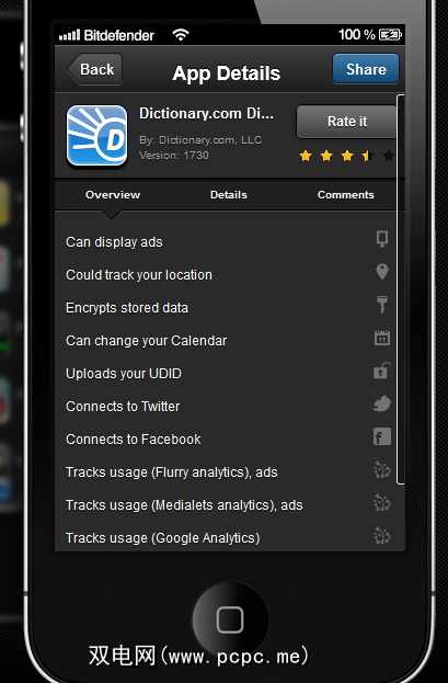 在概述< / em>屏幕上,您将了解该应用程序如何处理您的数据。例如,在这里,您可以看到Dictionary.com的应用程序可以访问和更改您的日历并跟踪您的位置。词典应用为何需要执行此操作?
