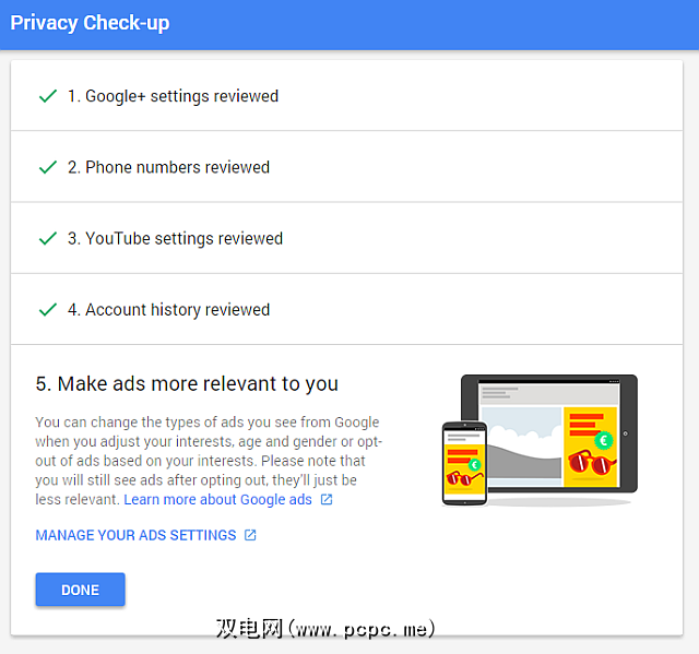 选择您与他人共享的Google+个人资料信息。仍然有一些令人信服的理由仍然使用Google +。帮助人们与您联系,或者通过检查Google是否可以自动将您添加为环聊和呼叫者ID的电话选项来禁止他们与他人联系。这仅适用于已经拥有您的号码的人,但是我们无法告知他们为什么随后需要Google的帮助。管理您在YouTube上分享的内容 ,例如您的喜欢,订阅,搜索内容,观看的视频,活动供稿中发生的事情等。您还将获得指向您在YouTube上上传的视频和播放列表的快速链接。请记住,这些数据完全在Google的服务器上,因此请进行一次操作,并确保那里没有您想要的东西。个性化您的Google体验是一种不错的方法说“让我们跟踪您!"这是一个大问题,您可以在其中查看Google正在记录的使用情况的一部分。该列表包括网络活动(也包括Google Chrome活动),设备信息,语音和音频活动,位置记录以及YouTube搜索和观看记录。实际上,清除视频搜索历史记录也可以提供更多相关建议。我们将决定如何激活和停用您的内容,但请记住仔细阅读每个部分的内容。使广告与您更相关,方法是管理您的广告设置,事情变得有些可怕。在您的广告设置中,您可以查看Google到目前为止(在Google以及整个网络上)如何根据您多年的活动来对您进行配置。您可以在此处选择退出广告,但似乎没有什么意义。 Google仍会收集有关您的信息,您将不会再基于该信息看到个性化广告。