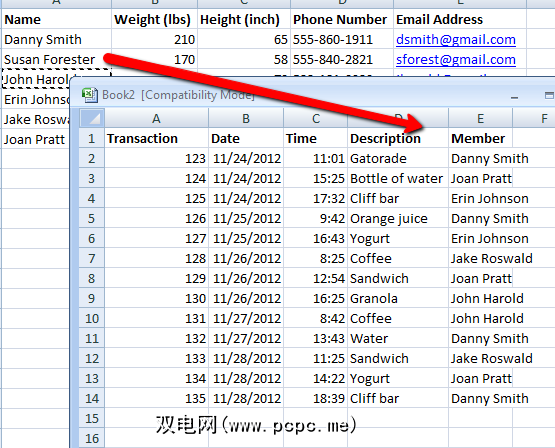 因为这是一个非常高科技的俱乐部,他们还向数据库中添加了另一个表格。下表每次成员每次在healthfood cafe购买商品时都会添加新数据。此事务(另一个用于记录增加或减少的数据库术语)直接在寄存器处进行。您会注意到,在两个表之间,有一些类似的数据,例如成员名称。还有唯一的数据,例如交易ID和日期和时间。