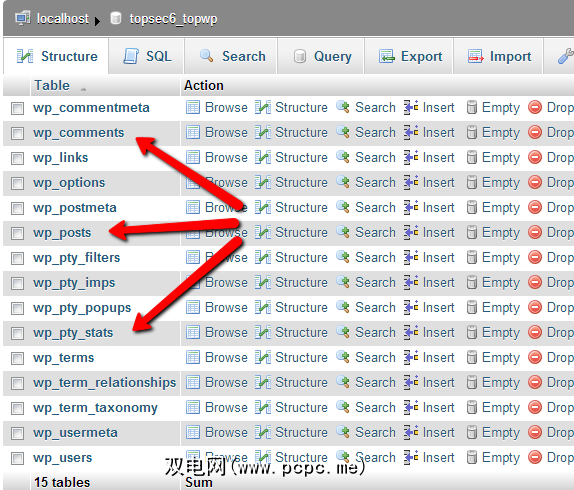如您所见,有一堆表(在这种情况下为15个)用于保存各种信息,例如用户详细信息,发布信息,评论等。这是WordPress博客的骨干,许多其他高级站点也具有类似的数据库后端。