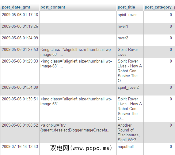 打开其中一个表(例如posts表)时,您会看到所有在实际网页上显示的信息就存储在数据库内部。