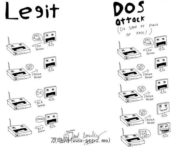 A(S)SYN Flood滥用此机制发送不计其数的TCP / SYN包(每个包都指定了不同的假来源)。每个软件包都提示服务器创建连接并继续发送确认。不久之后,服务器已用半开连接用完了自己的资源。以上原理由Redditor的相似之处绘制和发布,在漫画中得到了说明。