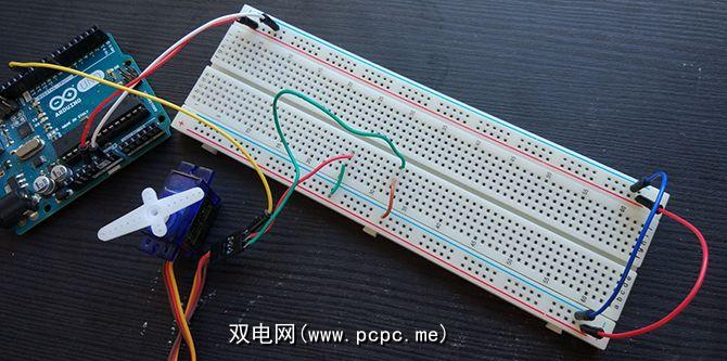 上面的图片显示了一个伺服器,它需要电源以及Arduino的说明。我们将电缆从Arduino的 5v 和 GND 引脚连接到顶部的电源轨。然后,我们在另一端桥接间隙以向底部电源轨供电,并使用小段电线为伺服器的 VCC 和 GND 电线供电。这种用于电源线的桥接技术是一个很好的实践,因为它将确保您的组件无论在面包板上的任何位置都始终可以访问电源。
