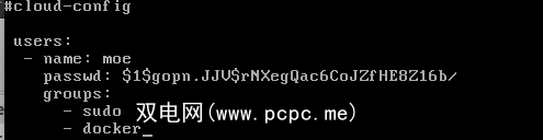 #cloud-configusers: moepasswd: [SSL password]groups:- sudo- docker