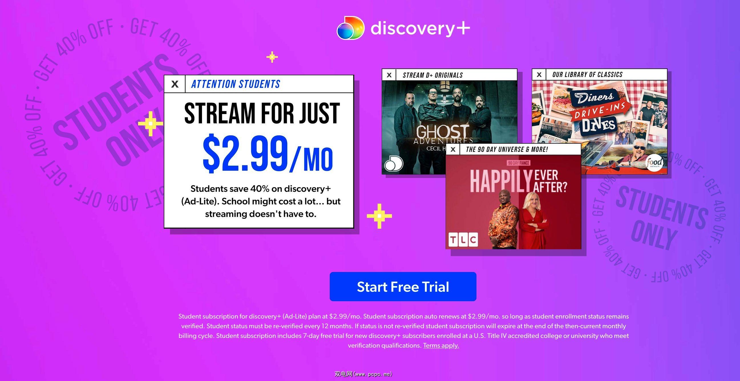除了上面列出的主要计划外,Discovery+ 还提供学生折扣,尽管它仅适用于美国。学生可以以每月 2.99 美元的价格使用 Discovery+ Ad-Lite 计划,只要他们是学生,每个月最多可节省 40%。此外,他们还可以获得 7 天的免费试用期,就像两个主要计划一样。