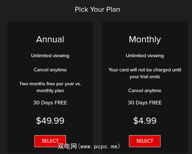 在两个计划中可以观看的视频数量没有限制,并且当您注册为新用户时,两个计划都提供30天的免费试用期。