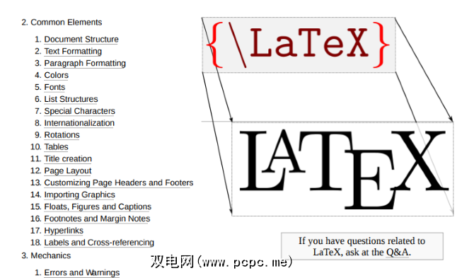 LaTeX是Wikibooks上标题恰当的书,是一个很好的起点。这是LaTeX系统的综合指南,其中包括从目录到索引的所有内容。错误和警告,算法,定理,高级数学以及您可能需要在LaTeX中进行的其他任何操作。