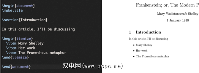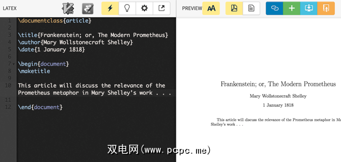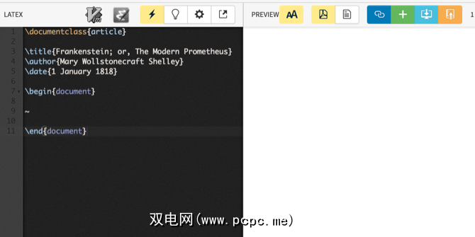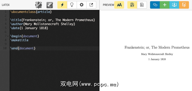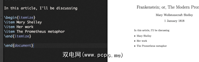 \title{Frankenstein; or, The Modern Prometheus}\author{Mary Wollstonecraft Shelley}\date{1 January, 1818}现在,您会注意到这些信息当前都没有显示在我的文档中(预览在屏幕的右侧):