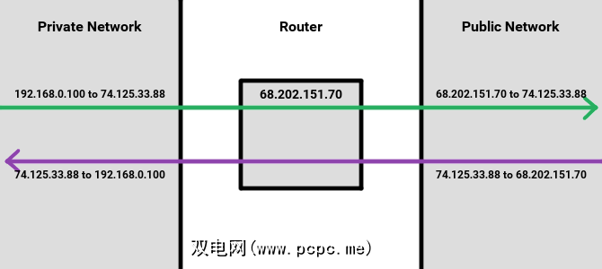 当路由器从专用网络上的设备收到请求时,会将数据包放在一边,以便进行某些更改。首先,每个数据包的“源IP"从专用IP地址(例如192.168.0.100)更改为路由器的公共IP地址(例如68.202.151.70)。其他次要细节也被更改。