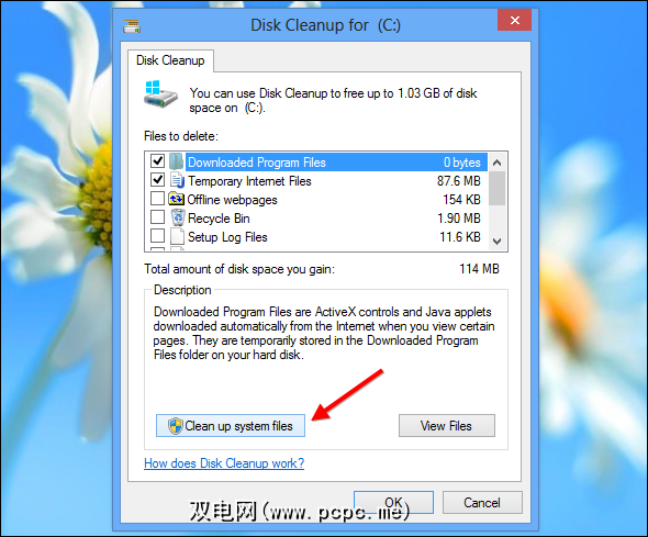 单击在“磁盘清理"窗口中清理系统文件按钮。