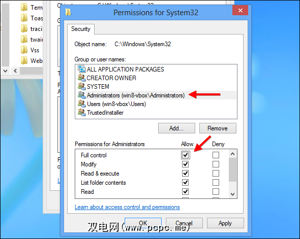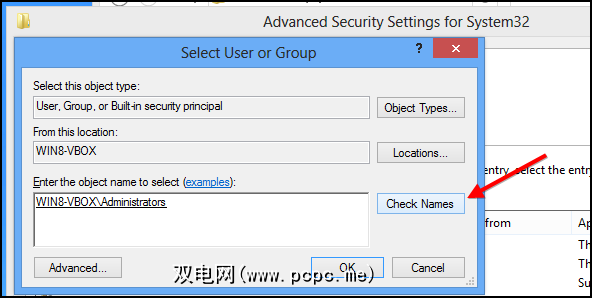 在框中键入 Administrators ,然后单击检查名称。 按钮。 Windows将自动完成其余的名称。这将所有权授予系统上的所有管理员。单击确定按钮以保存此更改。