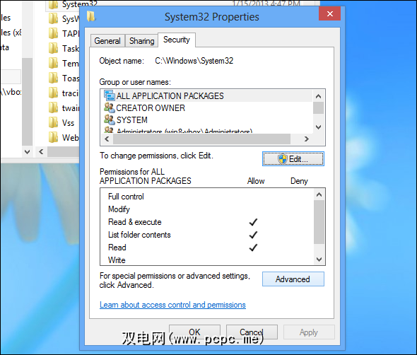 在属性窗口中单击安全性标签,然后单击底部附近的高级按钮。