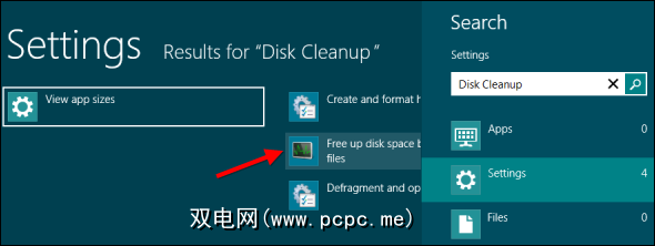 要打开磁盘清理向导,请按Windows键并键入 Disk Cleanup 。在Windows 7上,单击“开始"菜单中出现的磁盘清理快捷方式。在Windows 8上,单击设置类别,然后选择“ 通过删除不需要的文件释放磁盘空间"快捷方式。