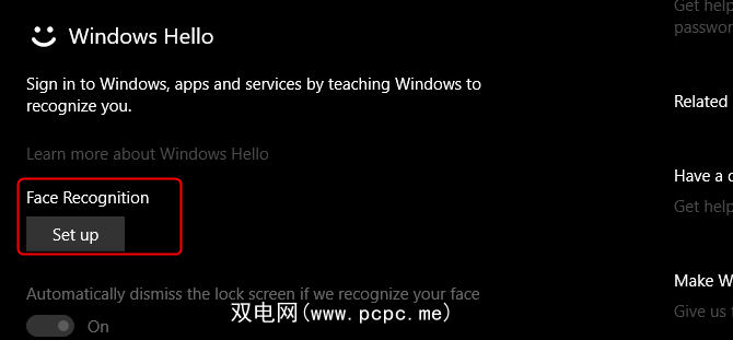 如果您拥有兼容的系统,则很容易设定。在人脸识别标题下,点击设置。 (如果计算机使用指纹扫描,则应在指纹标题下选择设置。)