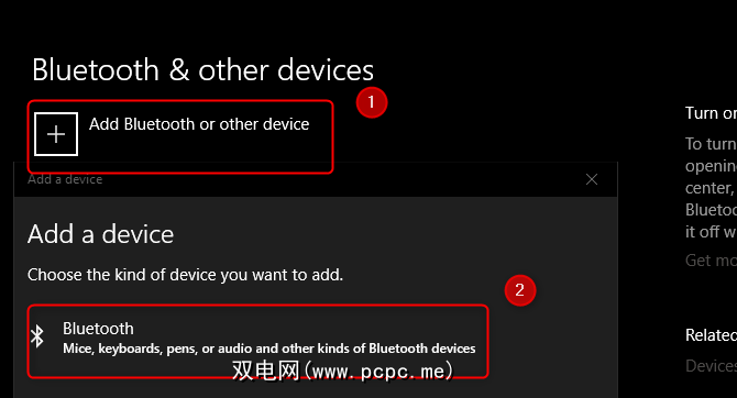 选择蓝牙和其他设备设置。然后选择添加蓝牙或其他设备。当提示您选择设备的类型时,请选择蓝牙。