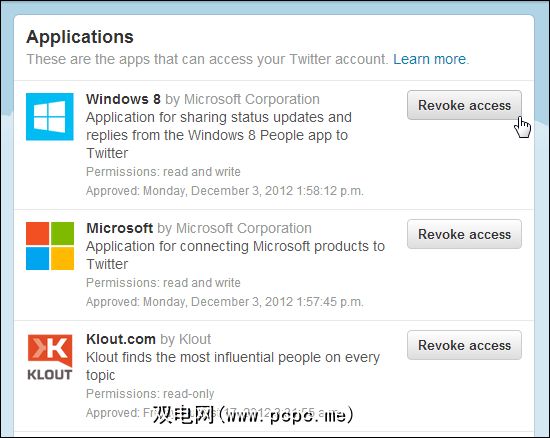 要管理允许访问您帐户的应用程序,请单击设置页面上的“应用程序"标签。使用“撤消访问权限"按钮可以禁用不再使用的应用程序的访问权限。