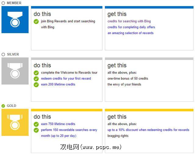 作为Bing Rewards的成员,您的帐户可以是三个等级之一(它们都是免费的):