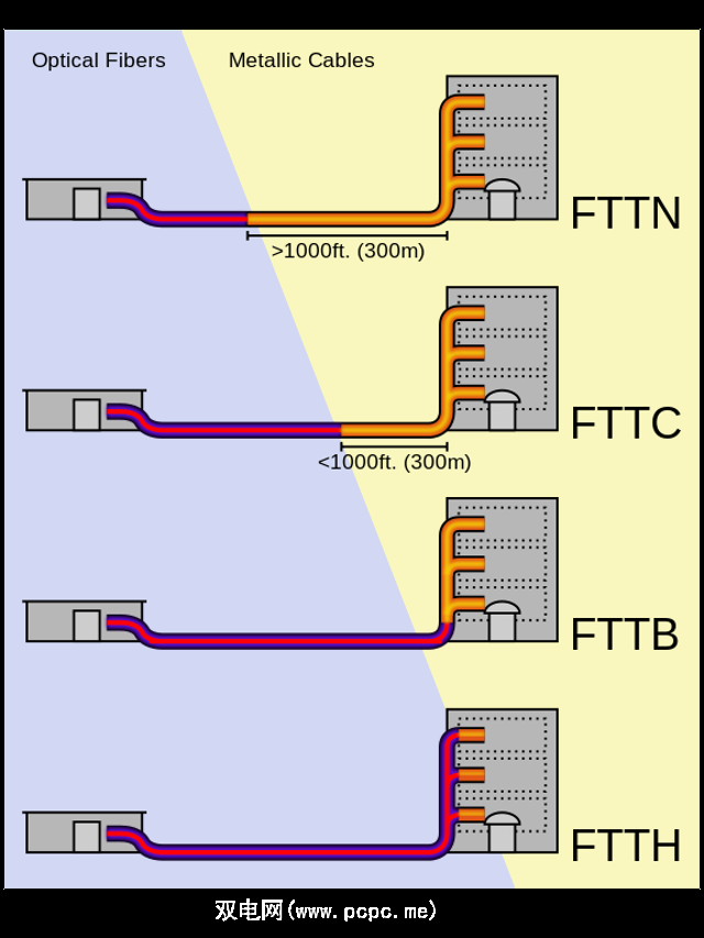 FTTP,也称为家庭光纤(FTTH),是从Internet服务提供商(ISP)直接连接到用户家庭或企业的纯光纤电缆连接。光纤电缆由一根或多根设计成承载光的光纤制成。这些光纤具有人发的宽度,并覆盖有两层塑料,以在光纤周围形成一面镜子,实现全内反射。