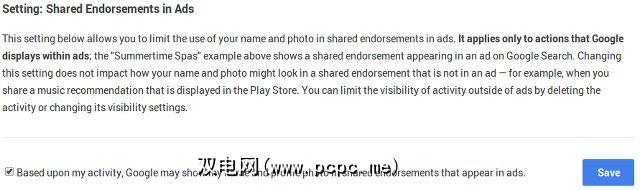 首先,对+1和以下用户的评论18岁根本不会出现。其次,您可以选择不参与共享认可。您需要做的就是登录到Google帐户后进入“共享认可"设置页面,取消选中您对新广告的许可,然后点击保存。此设置仅适用于由Google提供支持的常规网络广告中的“共享认可",无法在Google Play服务中关闭“共享认可"式的建议。再说一次,它们在这里非常有用,并且已经存在了一段时间。