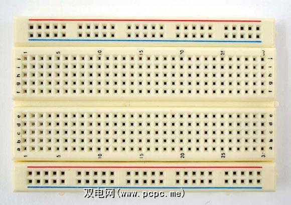 较大的面包板以固定模式同时具有水平和垂直连接。最外面的孔通常是彩色的,并用作电源的“导轨"。很小的面包板可能没有这个,因此很明显,找出特定板子具有的精确连接模式很重要。