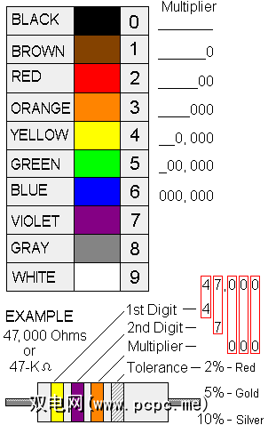 您如何知道电阻器的值?很简单,但是您需要参考色表。每个电阻上都有许多彩色的带:前两个代表一个数字值,而下一个代表要加到该值末尾的零数字(乘数)。第四个是公差带,它显示了电阻器实际可能变化的幅度,但是在此阶段您不必担心。
