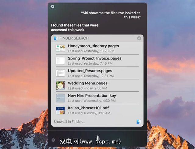 Siri for Mac将还可以像Spotlight一样工作,使您可以使用自然语言搜索Finder。索取从特定联系人发送给您的文件,或者索取您在5月份工作的文档,Siri将承担义务(El Capitan已经可以使用Spotlight完成大部分此类工作)。获得一些结果后,您可以将文件直接从Siri拖放到您正在执行的操作中,就像现在使用Spotlight一样。