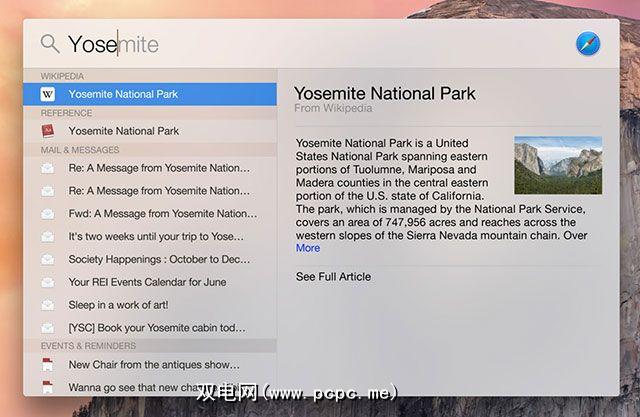 “您键盘上的所有内容"应用程序中的其中一个?看来苹果也是如此。现在,Spotlight看起来很像Alfred,并且比以往任何时候都可以使用更多的服务。搜索功能现在作为一个浮动框显示在屏幕中间,而不是按照传统方式绑定到菜单栏。您可以搜索新闻源,iTunes和Mac App Store,Wikipedia,地图,Yelp,使用快速Cmd +空格键搜索查询来获取电影时间并执行快速货币或单位转换。