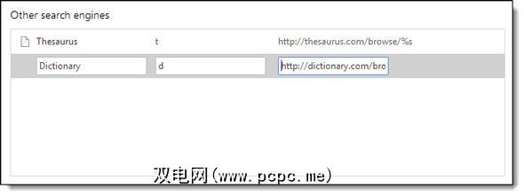 我最喜欢的词典之一是Dictionary.com(或其子页面:Thesaurus.com)。将它们设置为自定义搜索引擎,我可以从多功能框中访问它们,这是一个简单的过程。针对Chrome进行了说明: