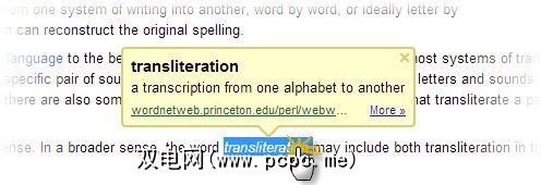 有一半的人正在使用Chrome的官方词典扩展,因此它可能是最快的单词搜索方法。当然可以节省一些打字。安装扩展程序后,只需双击任何单词即可在一个小的弹出气泡中查看其定义。单击更多链接时,主要定义使用其他词典,可将您带到Google上相同的扩展页面。该扩展程序支持多语言词典,因此您可以在其他语言的网页上方便地使用它。如果您喜欢扩展方法,这里有– 7个Chrome扩展可以帮助您在浏览时查找单词和含义。