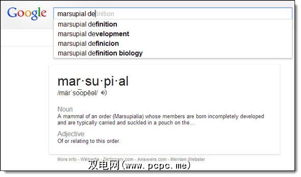 只需在搜索框中输入[您的关键字定义]。在Google在搜索页面顶部为您提供含义之前,您无需完成“定义"的键入操作,只需在其中输入要按下音频发音的图标即可。单击“更多信息"将带您到展开的页面,在该页面上您具有特定单词的完整涂料。您也可以单击下面提到的单个在线词典链接,以小字体显示。许多信息都来自Wikitionary以及其他来源。点击清除返回Google搜索页面。