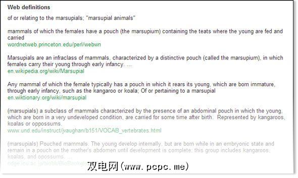 如果使用 define,您将获得相同的结果。 :运算符,后跟关键字。上面的屏幕显示了一个示例。单击“更多信息"链接,您将进入该词的用法的相同详细页面。