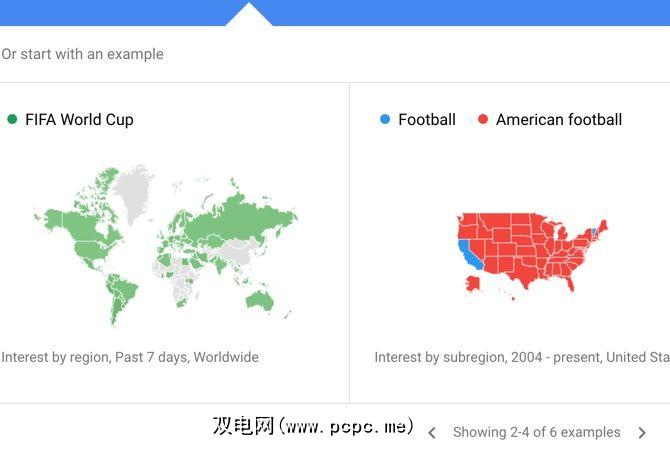 在Google趋势首页上,您会看到一些主题探讨的入门示例。在撰写本文时,这些因素包括过去一周对FIFA世界杯的关注以及自2004年以来对全球“ cupcake"一词的关注。