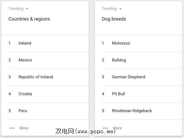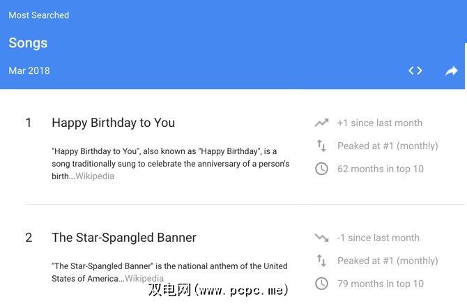 此外,在左侧栏中的热门图表标签上,您还可以查看各种类别的趋势(搜索最多,通过下拉列表)。其中包括动物,作者,电影,歌曲等。